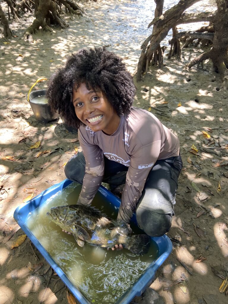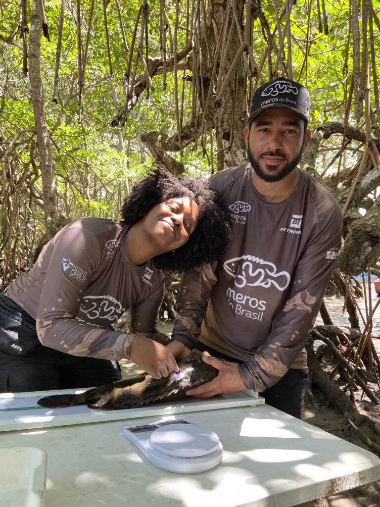 Já no primeiro dia de campo, soube que finalmente iria ver um mero! Quando encontrei o animal e pude segurá-lo, foi como ganhar um presente da natureza. Aquele peixe amarronzado, com várias pintinhas pretas no rosto, era ainda mais bonito pessoalmente. E uma das imagens que nunca vou esquecer foi o momento em que eu e Rafael, supervisor de pesquisa no estado, o devolvemos ao mar. Ficou marcado para sempre.”